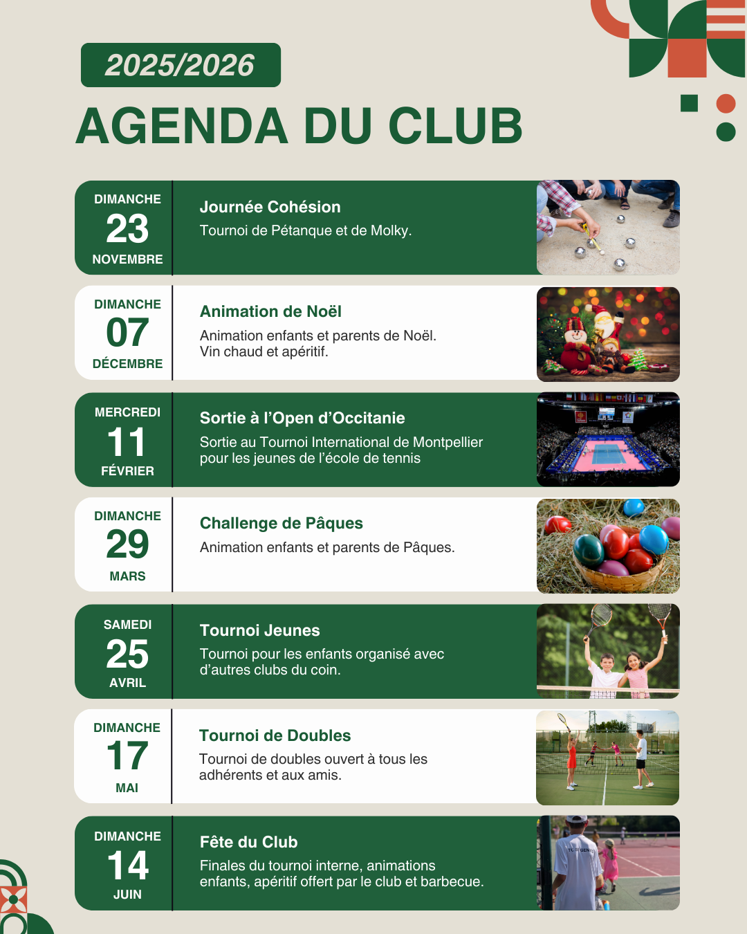 Ci-dessous, le programme pour la saison 2025/2026 ! Des tournois, des animations et surtout beaucoup de plaisir.